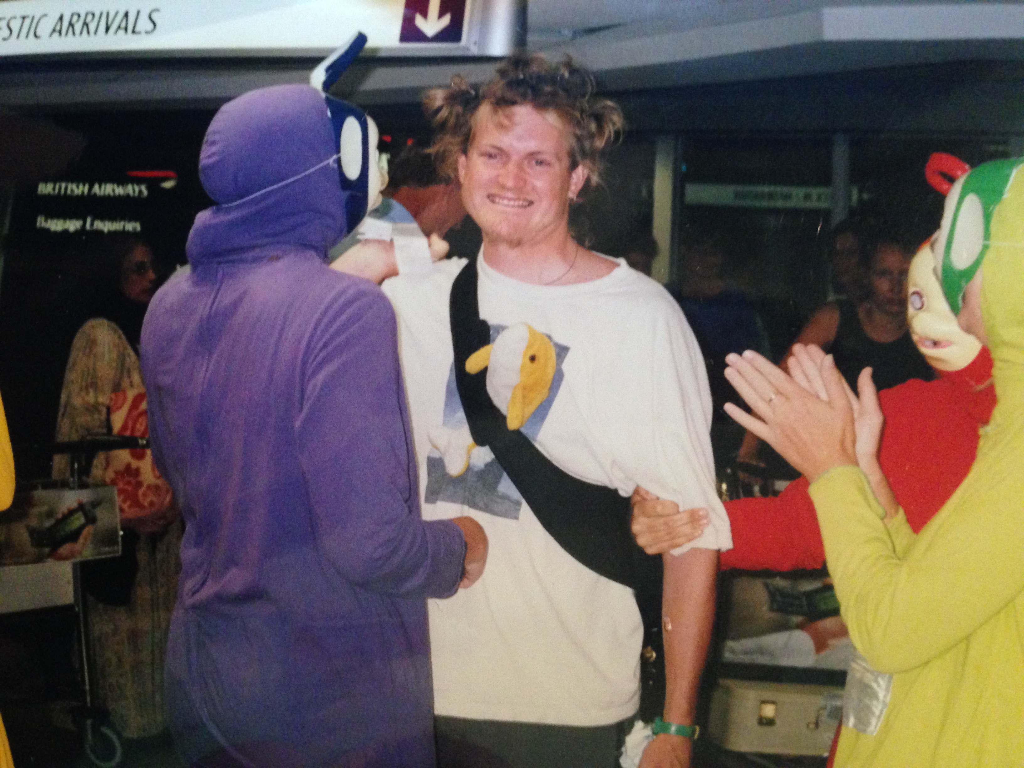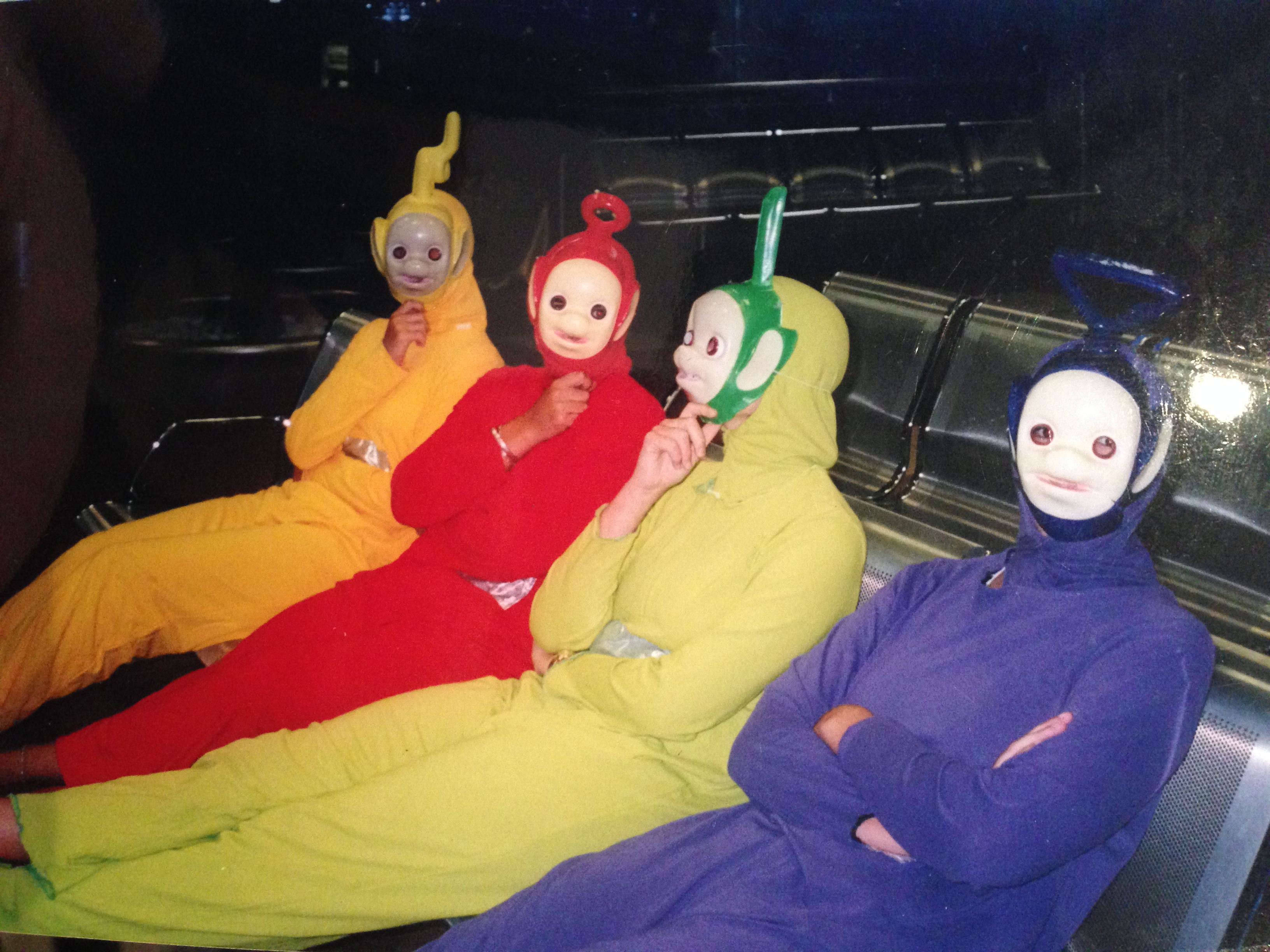 My friends had gotten two of their friends to join them, hired actual flippin Teletubby suits and greeted me at the airport wearing them. But Dipsy wanted to dance… game on.